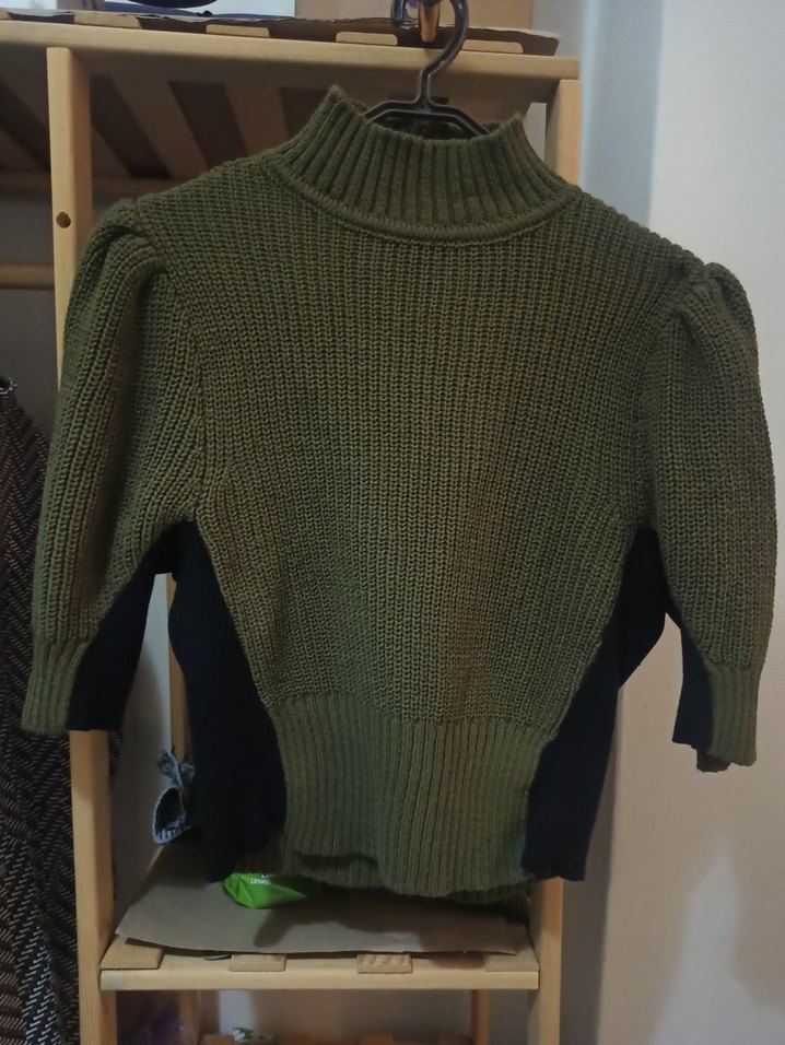 Çok az giyildi. Koyu yeşil, balıkçı yaka ve uzun kollu, vücuda oturan triko kazak, günlük kullanım için rahat ve şık bir sokak stili sunar.
