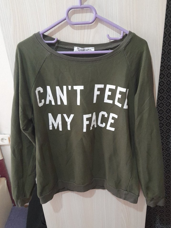 Uzun kollu, yuvarlak yaka ve bol kesim olan bu haki sweatshirt, yumuşak sentetik kumaştan örülüdür ve önünde baskılı yazı vardır.