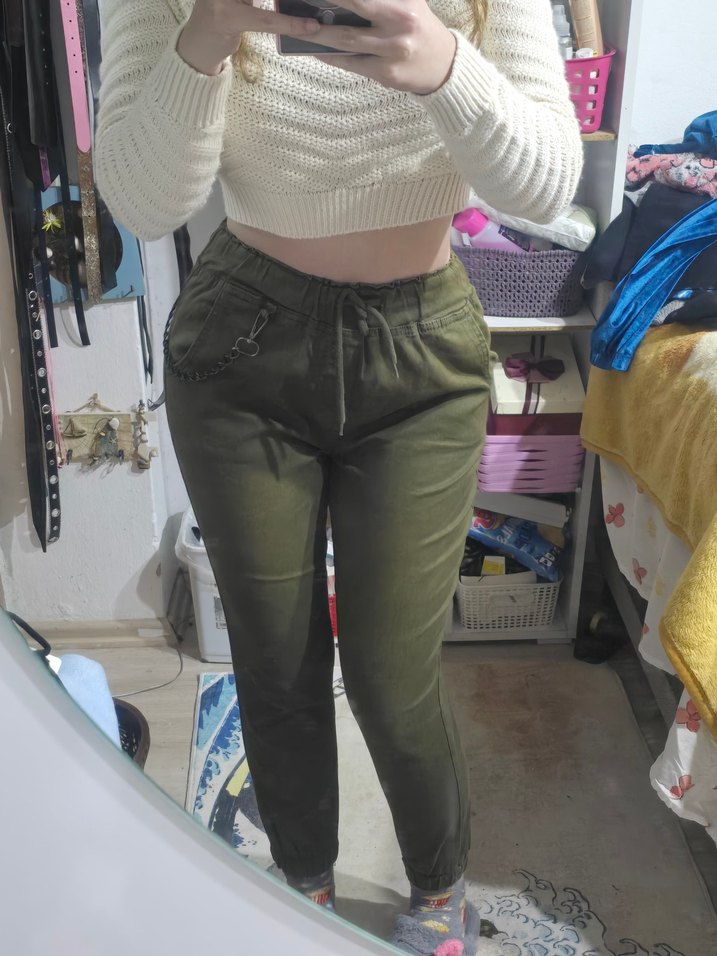 Örgü kumaştan, bol kesim ve haki renkte, midi boy kadın pantolon. Bel detaylı ve gündelik kullanıma uygun, trend sokak stili.