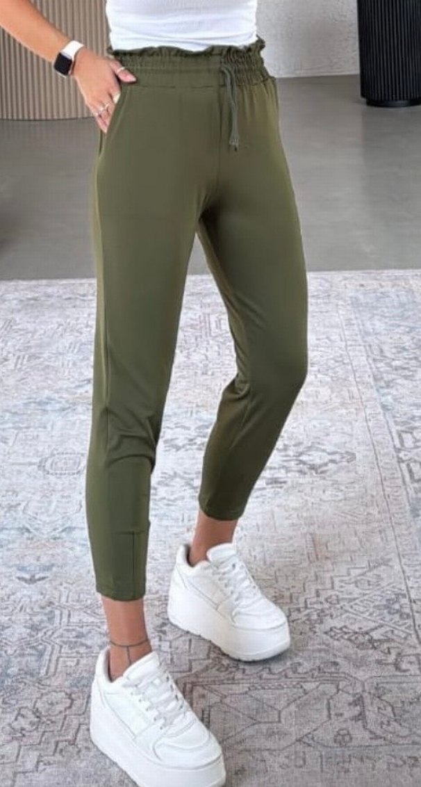 Kadınlar için haki renkte, beli lastikli, rahat kesim ve midi boy kumaş pantolon. Yumuşak sentetik kumaştan üretilmiş, günlük kullanım için uygundur.