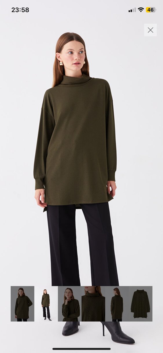 Kadın tunik, bol kesim ve midi boyda, boğazlı yakalı ve uzun kolludur. Yumuşak ve sıcak kumaştan yapılmış, günlük kullanım için rahat ve şık koyu haki renktedir.