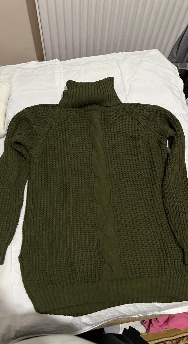 Kadınlar için boğazlı, uzun kollu, fitted kesim örgü triko kazak. Haki renkte, rahat ve günlük sokak stili için uygundur.