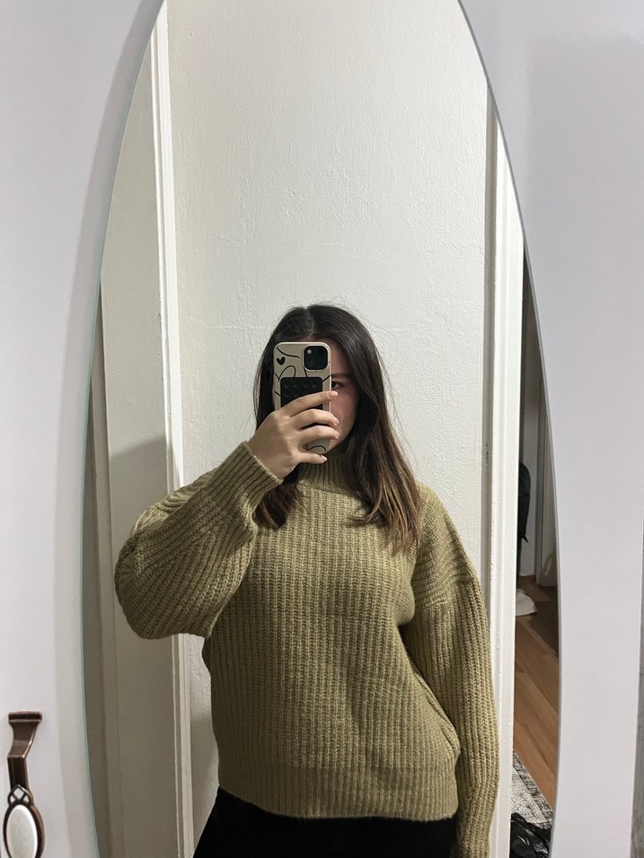 Kadınlar için boğazlı, fitted kesim, normal boyda haki renkte örme triko kazak. Rahat ve normcore tarzda, günlük kullanım için uygundur.
