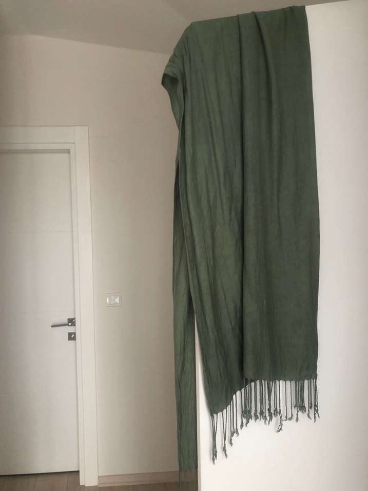 Yumuşak kumaştan, haki renkte kadın şalı. Drape tarzda, püsküllü kenarlarıyla minimalist bohem stilini yansıtıyor.