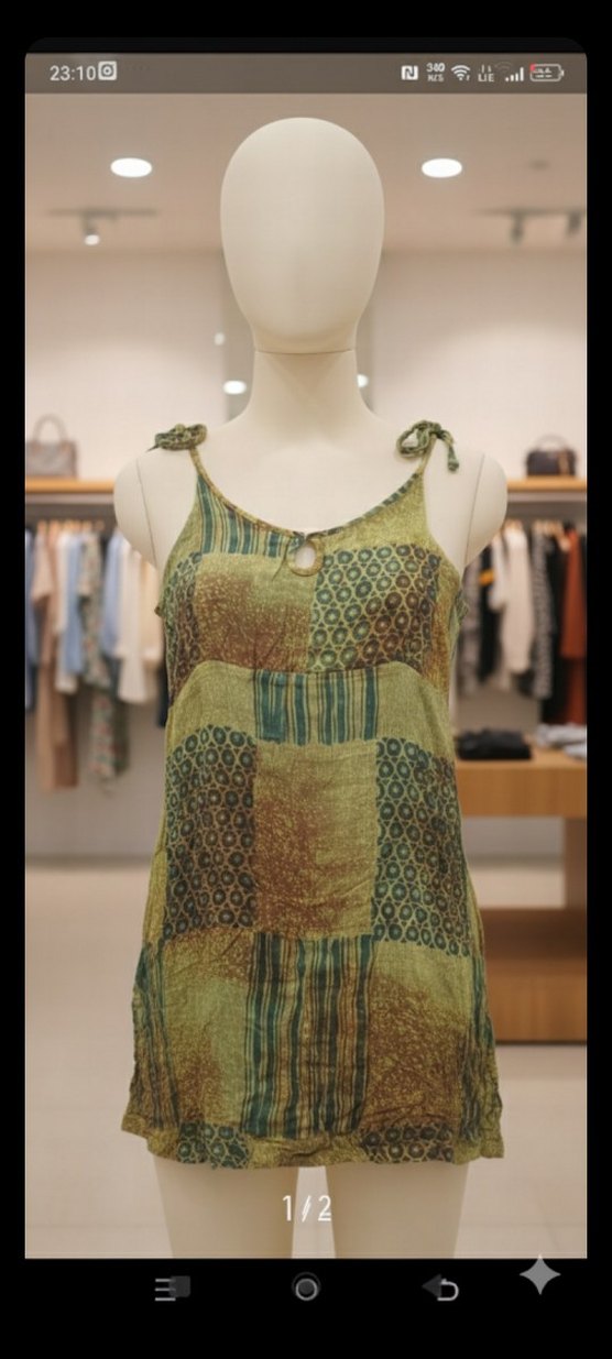 Askılı, düğmeli, bol kesim, parlak bağlama desenli haki uzun tunik. Straplez yaka ve bağlama detaylarıyla bohem tarzına uygun.
