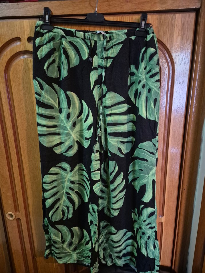 Kadınlar için haki yaprak desenli, salaş kesim ve dökümlü bohem tarzda, yumuşak penye kumaştan uzun pantolon.