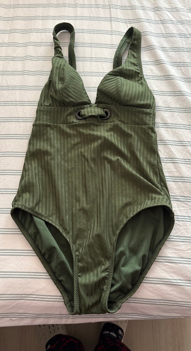 Fitted kesim, askılı ve bel kısmında tokalı detaylara sahip haki renkte mayo. Midi boy ve ince çizgili dokusu ile bohem ve athleisure tarzını birleştirir.