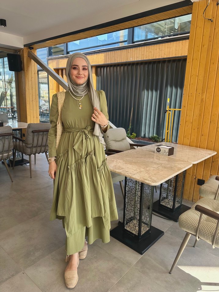 Haki renkli, bol kesim, drapeli uzun elbise. İnce askılı, yüksek yakalı ve etnik desenlidir. Günlük kullanıma uygun, yumuşak sentetik kumaştan yapılmıştır. 38 beden göğsünün yan tarafında fermuarlı var. Sadece 1 kez giyildi defo yok tertemiz elbise.