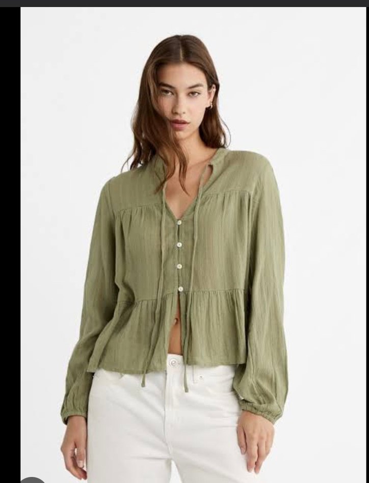 Haki renkli bohem tarzda, keten kumaştan, uzun kollu, V yakalı ve düğmeli, bol kesim midi uzunluğunda gömlek.