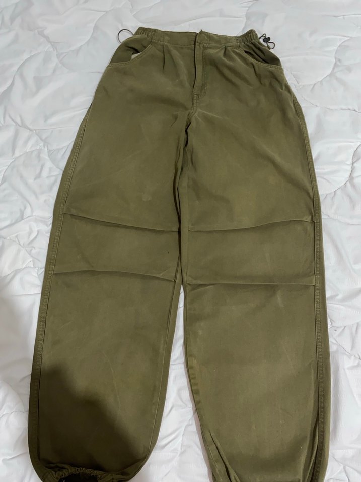 Kadınlar için bol kesim, kemerli, normal midi boyda haki pantolon. Parlak sentetik kumaştan, günlük dış mekan kullanımı için uygundur.