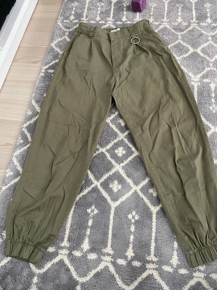 Kadınlar için kemerli bel ve lastikli paça detayıyla bol kesim haki pantolon, yumuşak sentetik kumaştan üretilmiştir. Rahat dış mekan kullanımı için uygundur.