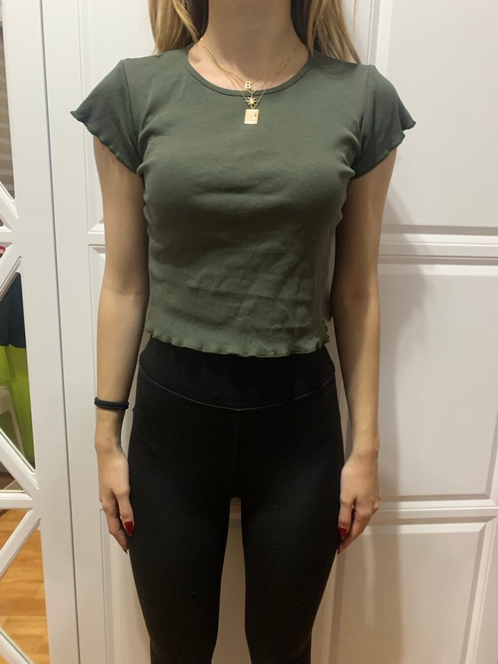 Kadın haki crop top, kısa kollu ve dar kesimdir. Sentetik kumaştan yapılmış olup günlük kullanıma uygun rahat ve şık bir görünüme sahiptir.