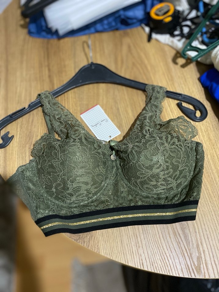 Kadınlar için koyu haki renkte, kısa boyda, dantel detaylı ve destekli için şeritli elastik bantlı bralet. 80B