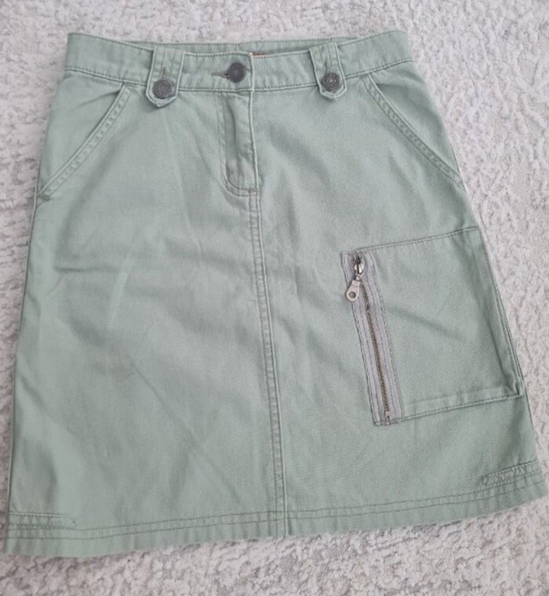 Kadın haki renkli denim midi etek, bol kesim ve fermuarlı cep detayına sahiptir. Desensiz ve dış mekan kullanımı için uygundur.