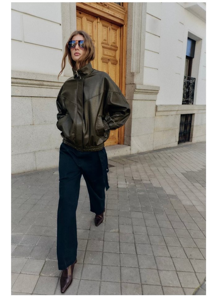 Kadın Haki Deri Bomber Ceket
