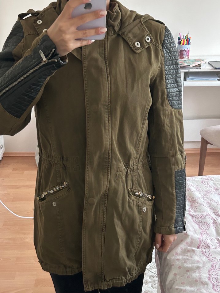 Haki renkte, deri detaylı uzun kollu, düğmeli, cep ve yaka detaylı kadın ceket, rahat kesimiyle sokak stiline uygun. Kol kısmında minik bir açılma var