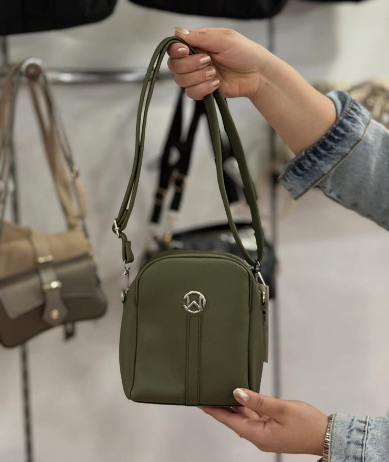 Haki renkte deri çanta, fermuarlı kapama ve minimalist tasarıma sahip. Trendy casual sokak stiline uygun, günlük kullanım için ideal.