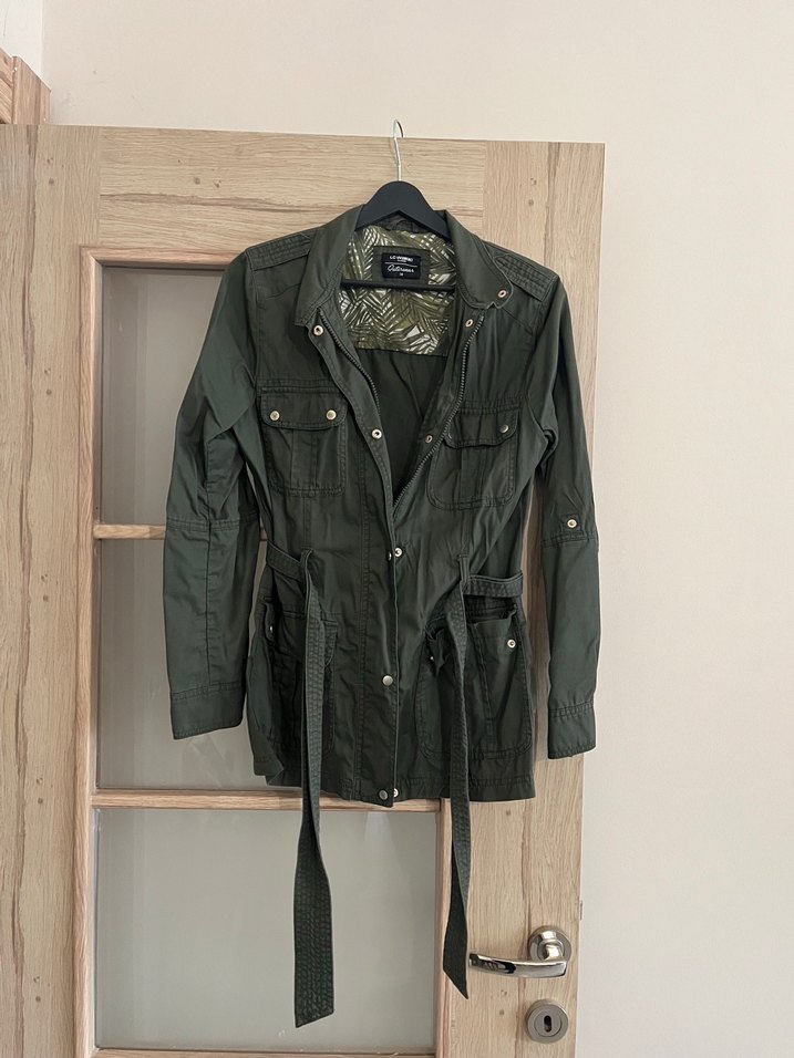 Kadınlar için kemerli, normal kesim ve haki kamuflaj desenli deri midi ceket. Çentikli yaka ve askılı kollarıyla günlük kullanıma uygun.