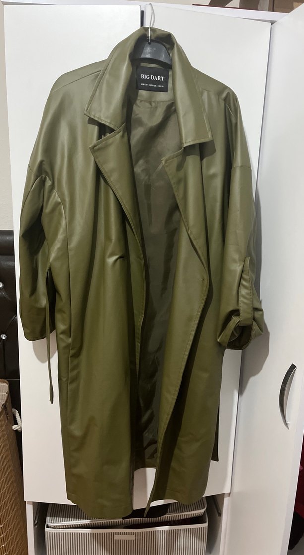 Bu kadın haki uzun deri trençkot, bol kesim, askılı kollar ve kuşaklı bel detayına sahiptir. Parlak yüzeyli ve kesik yaka tasarımlıdır.