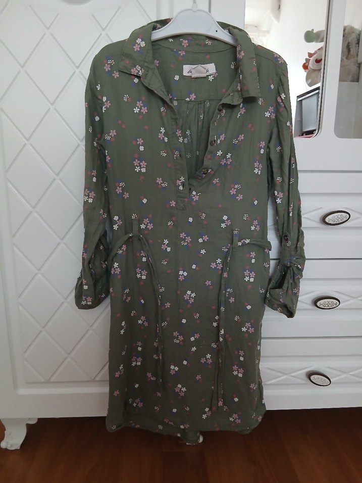 Haki renkli, çiçek desenli, pamuklu kumaştan, düğmeli ve V yaka uzun kollu bol kesim hamile tunik. Günlük kullanıma uygundur.