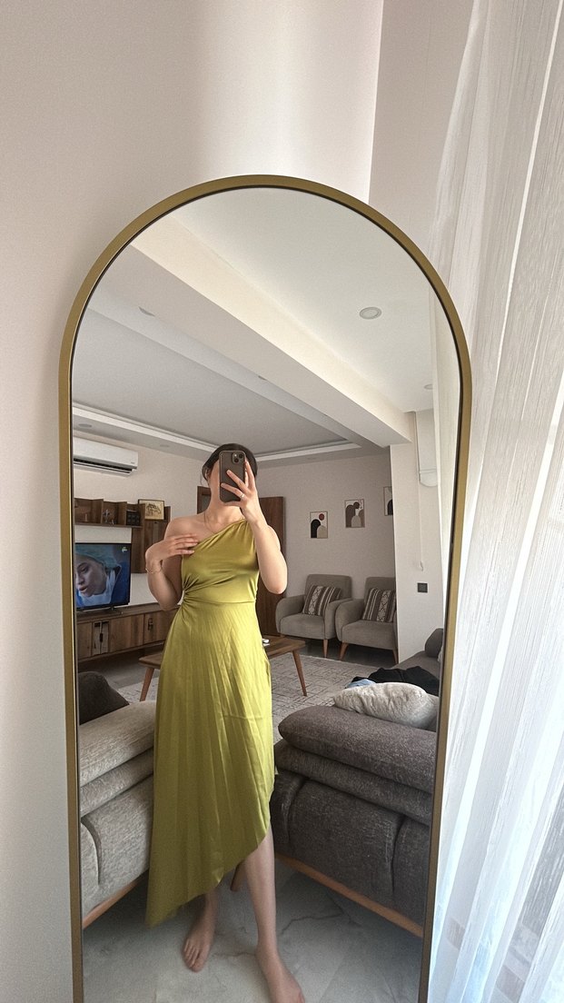 Kadınlar için straplez, drapeli ve parlak haki renkte, ipeksi kumaştan yapılmış, normal uzunlukta ve vücuda oturan midi elbise. Minimalist ve normcore tarzda, romantik akşamlar için idealdir.