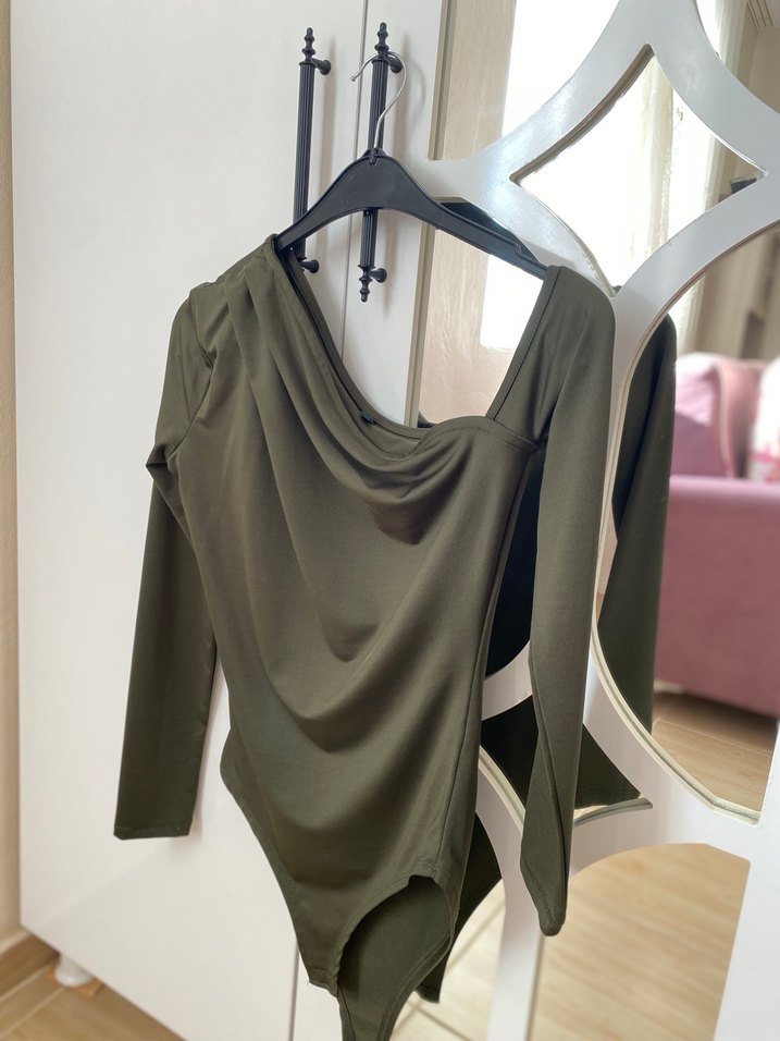 Kadın haki renkli, drapeli, tek parça mini bluz. Uzun kollu, kayık yaka ve vücuda oturan kesimle günlük kullanıma uygun minimalist tarzda. Çok az kullanıldı