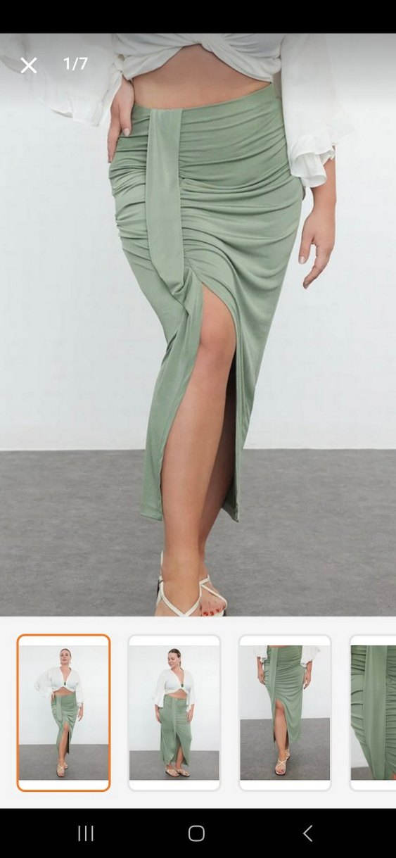 Haki renkli bu uzun etek, drapeli detaylar ve ön yırtmaç ile fit kesime sahip, yumuşak sentetik kumaştan üretilmiştir.