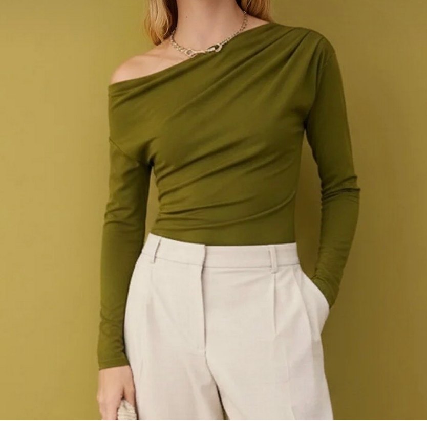 uzun kollu ve yuvarlak yakalı bluz. Yağ yeşili renginde, düşük omuzlu bluz Hiç giyilmedi