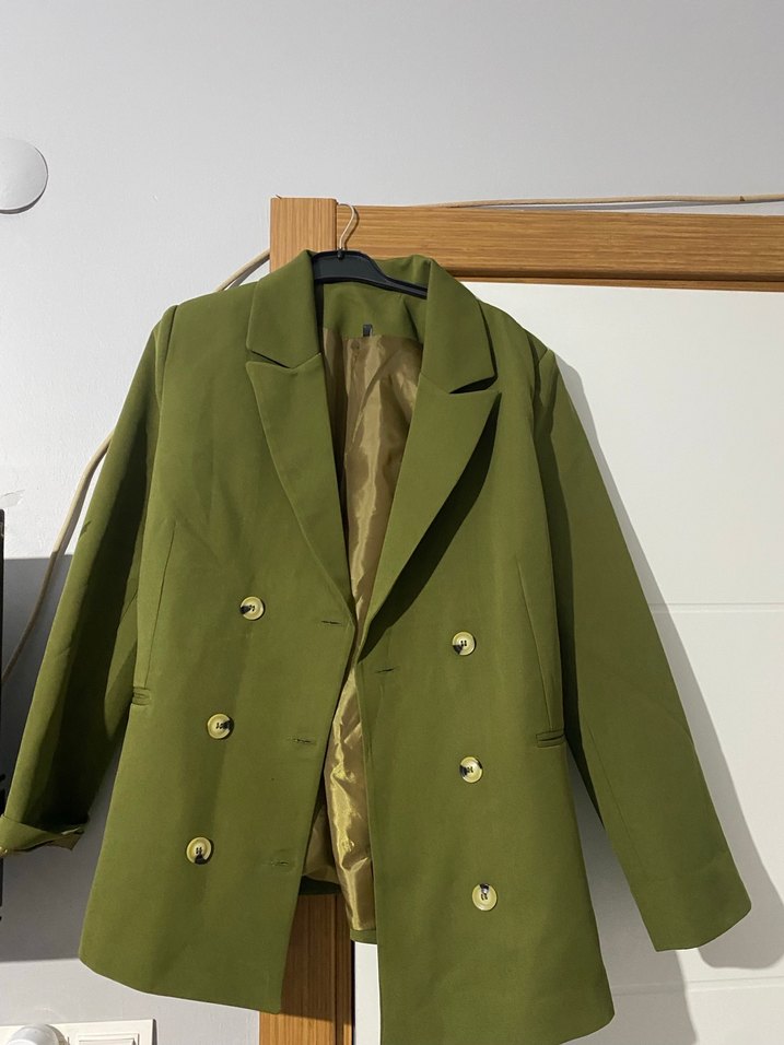 Kadın haki renkli blazer ceket, düğmeli ve kesik yakalıdır. Uzun kollu, normal boyda ve parlak sentetik kumaştan üretilmiştir.