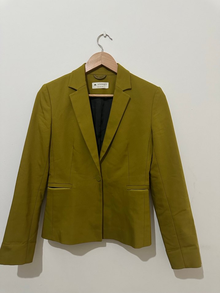 Kadınlar için haki renk, düğmeli, normal kesim, uzun kollu, notched lapel yakalı ve midi boyda sentetik kumaştan blazer ceket. Ofis için uygundur.