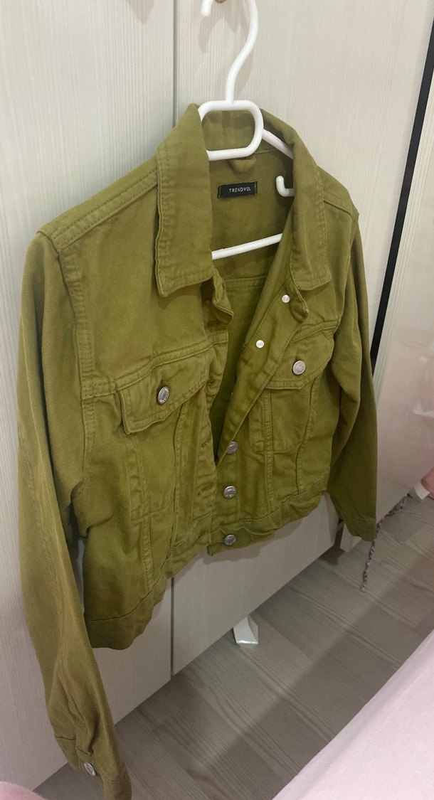 Bu haki renk keten denim ceket, düğmeli ve kesik yaka detayına sahiptir. Bol kesim ve uzun kolludur, günlük sokak stiline uygundur. ✨
