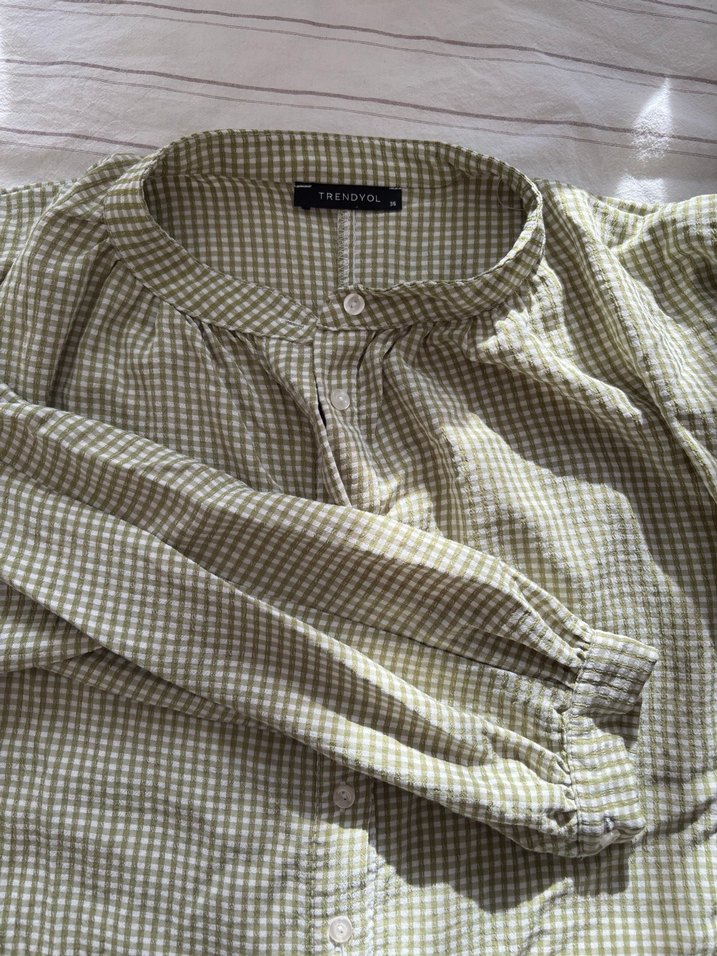 Kadın keten gömlek, düğmeli ön, yuvarlak yaka ve uzun kolludur. Haki gri renkte, bol kesim ve normal boyda, vintage sokak stili tarzında.