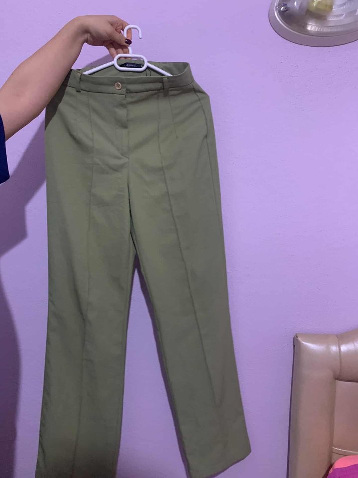 Kadın haki renk düğmeli, midi boyda, regular fit kumaş pantolon, günlük rahat kullanıma uygun.