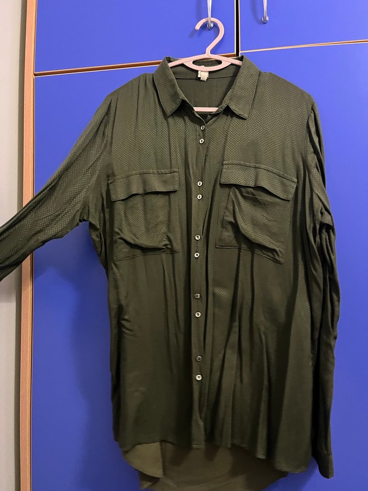 Koyu haki renkli, düğmeli, uzun kollu, bol kesim, normal midi boyda gömlek. İki ön cepli, sentetik kumaştan, günlük rahat sokak stili için uygundur.