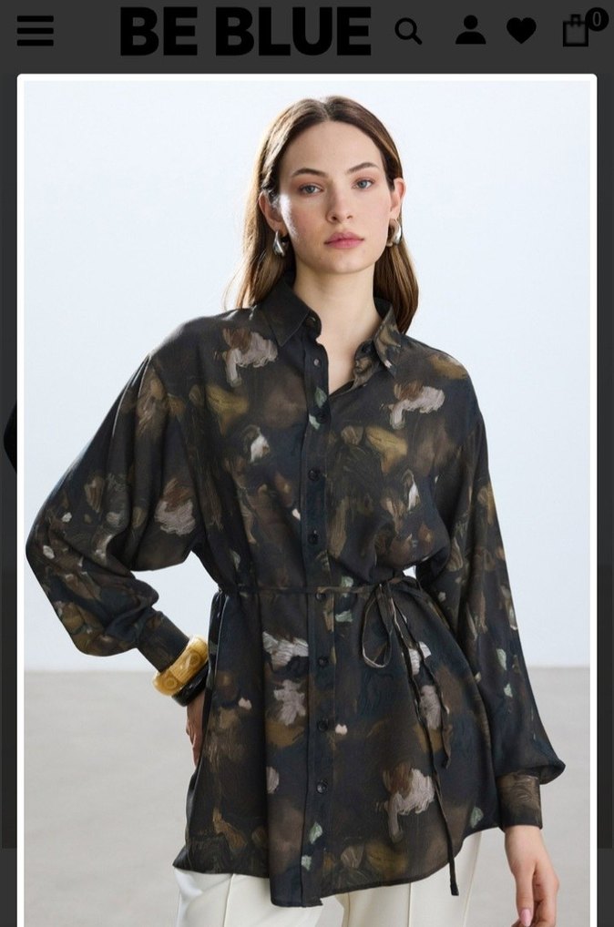 Kadınlar için bol kesim, yakalı ve uzun kollu gömlek. Koyu tonlarda batik desenli, düğmeli ve ipeksi kumaştan. Belde ayarlanabilir bağcık bulunur. Rahat günlük kullanım için uygun. Markası beblue