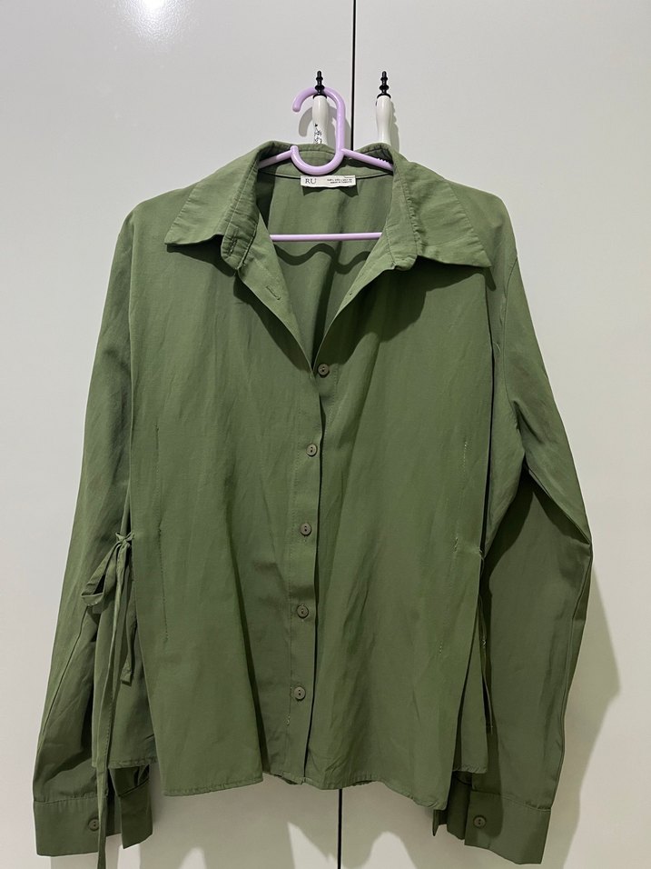 Yumuşak keten kumaştan, düğmeli, yakalı ve uzun kollu rahat kesim haki gömlek. Günlük kullanıma uygun.