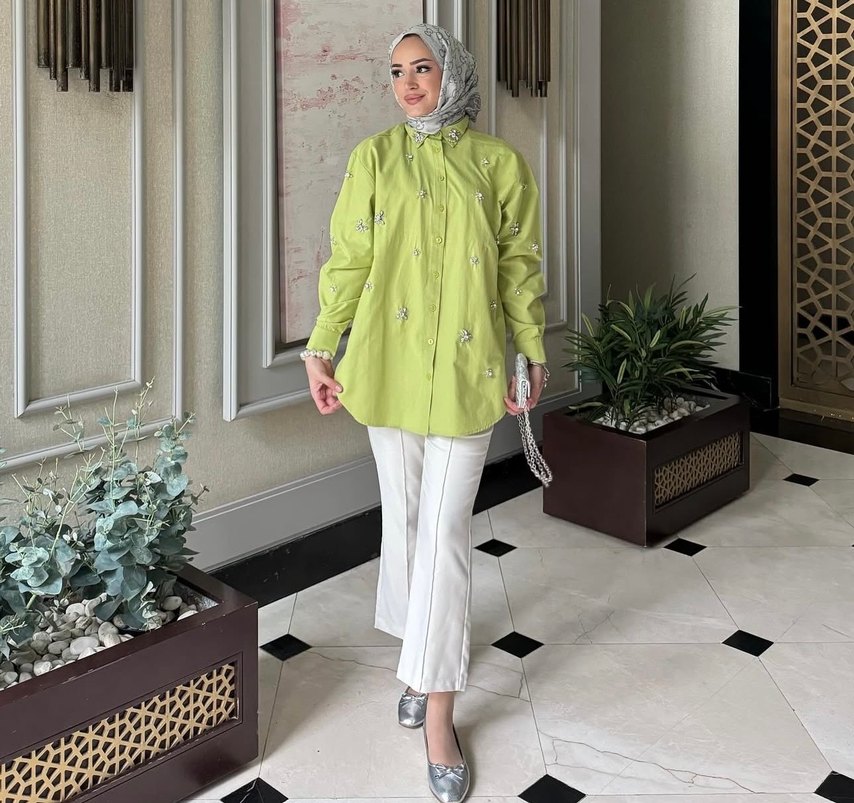 Haki renkli, düğmeli, uzun kollu ve yüksek yakalı tunik, yumuşak sentetik kumaştan, bağlama desenli, midi boy ve rahat kesimdir. Günlük kullanım için uygundur.