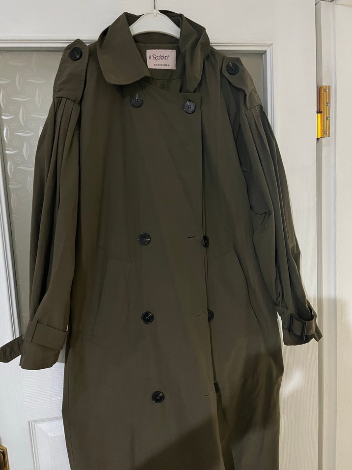 Kadın haki renginde, uzun boy ve bol kesim trençkot. Düğmeli ön ve kesik yaka detaylarıyla, sentetik kumaştan üretilmiştir. Günlük kullanıma uygundur. Kemersizdi düğmelidir çok şık durur aldığımda da kemeri yoktu