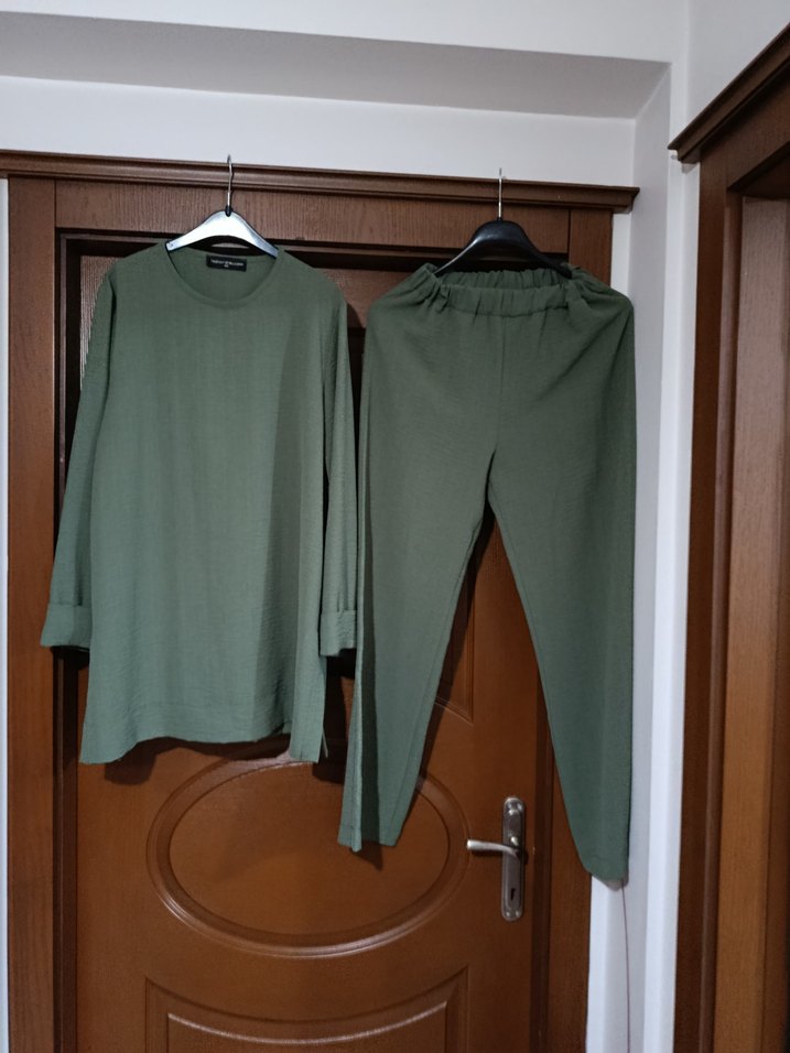 uzun kollu, yuvarlak yakalı, loose fit haki renk takımı. Midi boyda, rahat ve şık bir günlük kombin.