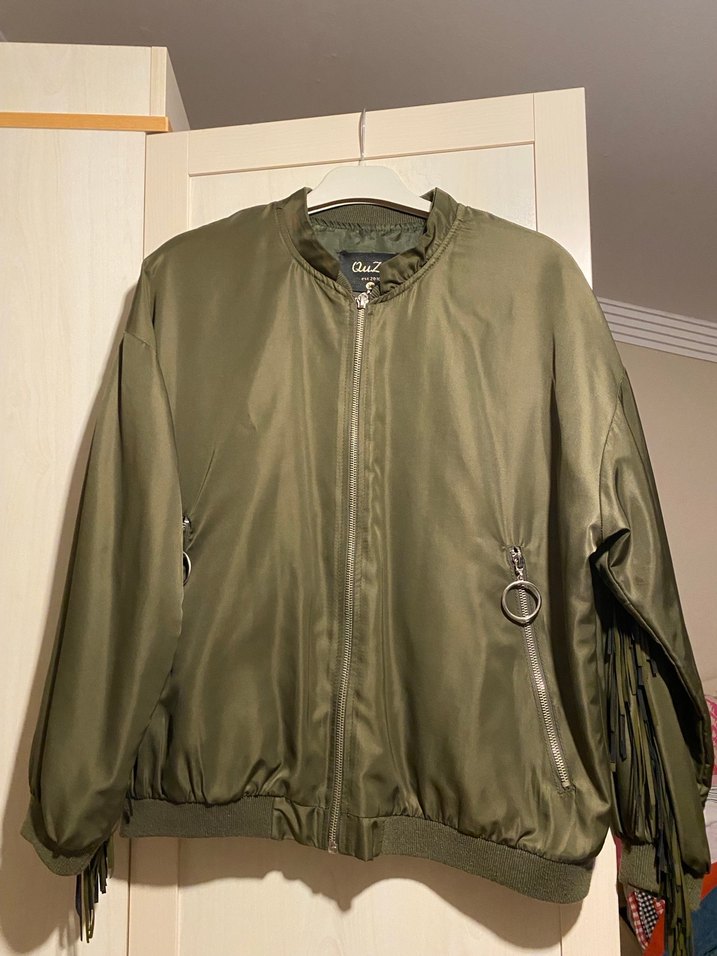 Kadın haki renkli, parlak sentetik kumaştan, fermuarlı ve cep detaylı oversize kesim ceket. Uzun kollu, normal midi boyda, kol ve sırt püskül detaylı ceket deforme yok 4-5 kez giyildi