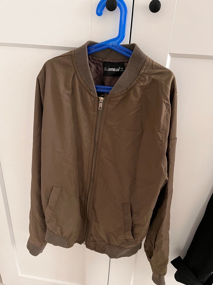Haki, fermuarlı, uzun kollu, notched lapel detaylı, rahat kesim kadın ceketi. Yumuşak sentetik kumaştan, günlük kullanıma uygun.