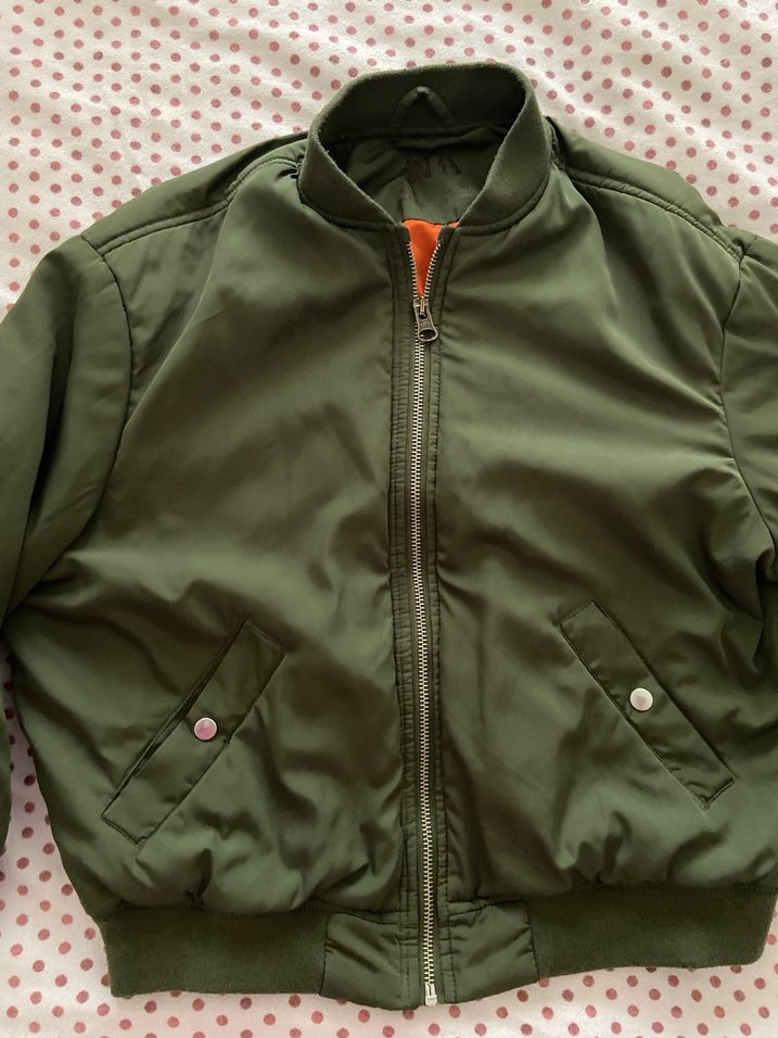 Kadın ceketi, parlak yeşil sentetik kumaştan, fermuarlı ön ve uzun kollu. Bol kesim, yaka detayı ve günlük kullanıma uygun minimalist tarzda.