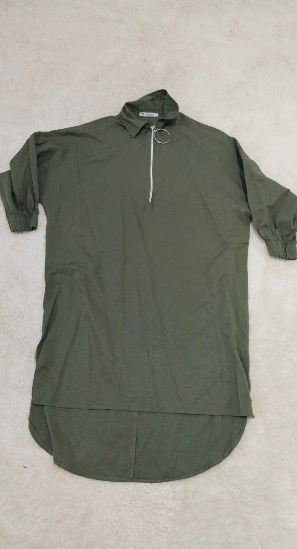 Kadınlar için kısa kollu, yakalı ve fermuarlı önde midi uzunlukta tunik. Bol kesim, sentetik kumaştan, haki renkte, günlük rahat stil için uygun.
