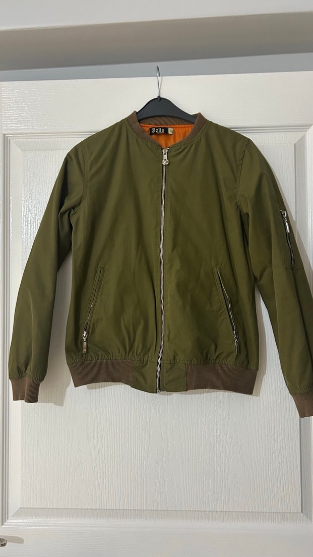 Fermuarlı cepleri ve ön fermuarı olan, parlak haki renkte sentetik kumaştan, uzun kollu ve dar kesim kadın ceket. Sokak stiline uygun bir parça.