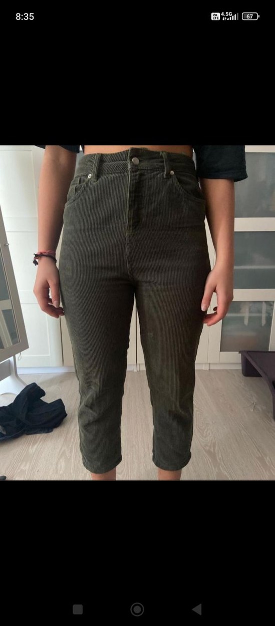 Kemer detaylı, fit kesim, midi boy haki renkli fitilli denim pantolon. Günlük kullanıma uygun sade tasarım.