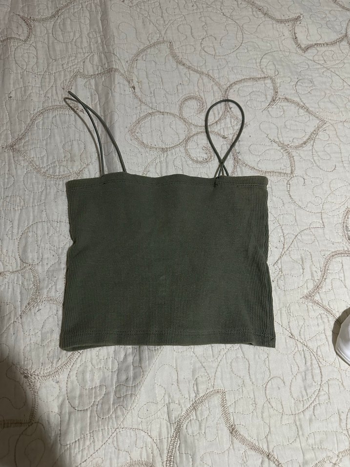 Kadın haki renkli, ince askılı ve straplez yakalı, kısa ve dar kesim mini atlet. Yumuşak sentetik kumaştan, minimalist günlük kullanım için uygun.