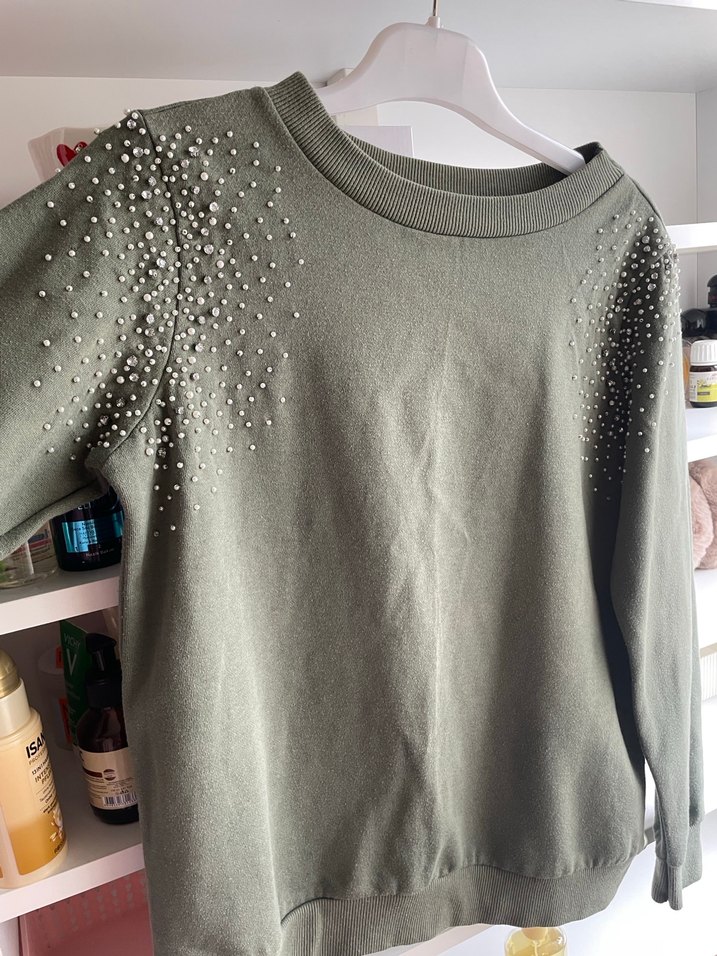 Kadın haki renkte, yuvarlak yakalı ve uzun kollu, yumuşak triko kumaştan yapılmış, inci detaylı salaş kesim sweatshirt. Sokak stiline uygun.