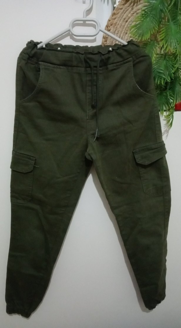 Kadınlar için koyu yeşil kamuflaj desenli, belden bağlamalı, bol kesim midi boy pantolon. Yumuşak sentetik kumaştan, günlük kullanıma uygun.