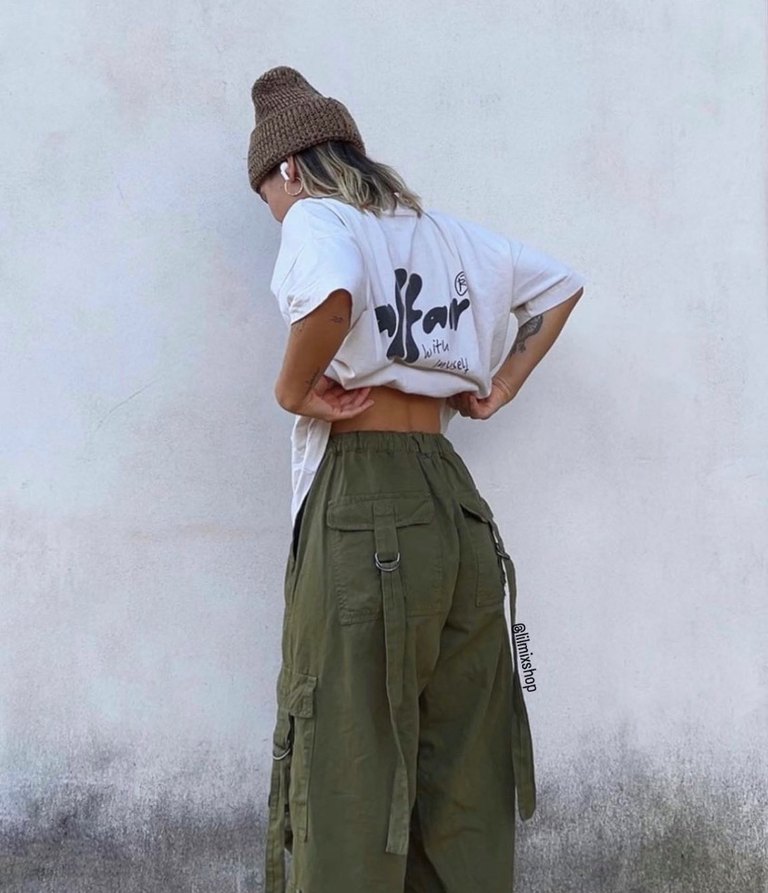 Hafif haki kamuflaj desenli, pamuklu, bol kesim ve midi boy kadın kargo pantolon. Sokak modası tarzında, rahat ve şık görünüm sağlar.
