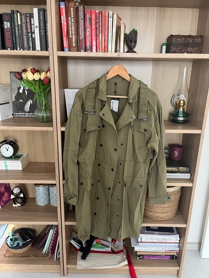 Kadınlar için keten kumaştan yapılmış, haki renkli, düğmeli, uzun kollu, yakalı ve bol kesim ceket. Günlük ve sokak stiline uygun. Kemeriyle beraber hiç kullanmadım